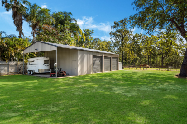 The separate 4-bay shed with attached carport (17.5m x 8m x 3.6m) is perfectly suited for those looking to run a home-based business, whether you're a mechanic, car enthusiast, or need ample storage for a boat, caravan, or horse float. With power, high ceilings, 3 x roller doors, a workshop, mezzanine, and a lockable storage cage, this space provides the perfect setup for a range of business or personal needs.